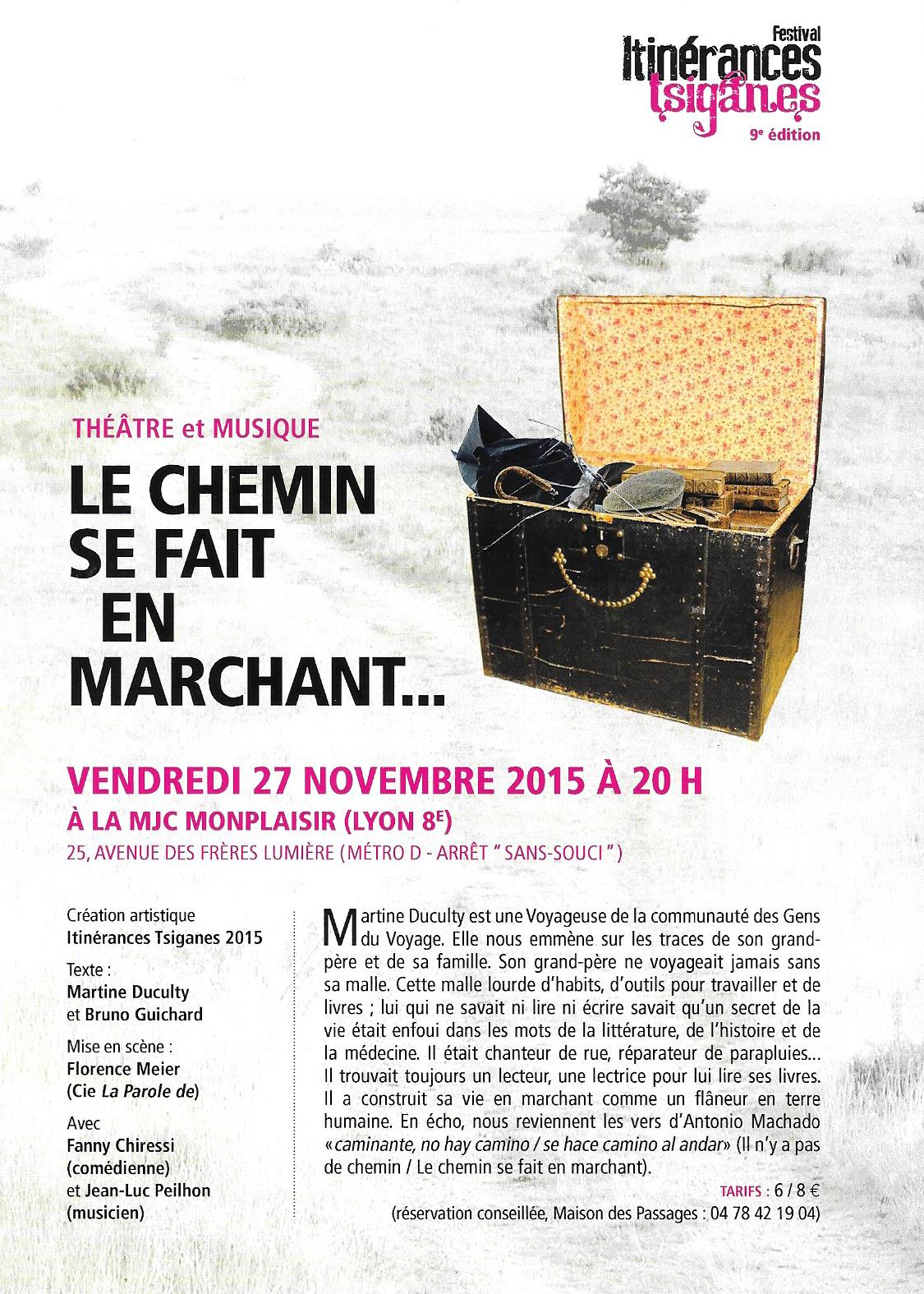 Martine Duculty est une voyageuse de la communauté des gens du voyage. Dans « Le chemin se fait en marchant », elle nous raconte son histoire, celle de sa famille manouche et nous mène sur les traces de son grand père. Celui qui ne voyageait jamais sans sa malle remplie d’outils, de vêtements et de livres…. celui qui aimait les livres sans savoir lire. Récit intime qui vient rencontrer le récit historique (celle de l’histoire de France), « Le chemin se fait en marchant » est aussi l’histoire d’une rencontre entre une voyageuse et un musicien poète : un « gadgo »… Deux personnages qui ont chacun un rapport au monde particulier, des croyances, des façons d’exister singulières et pourtant communes.